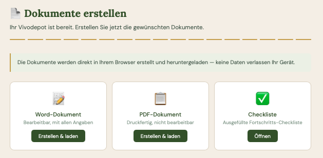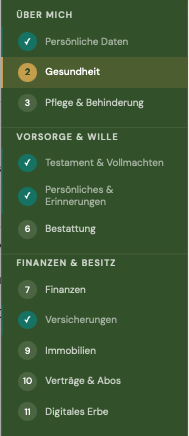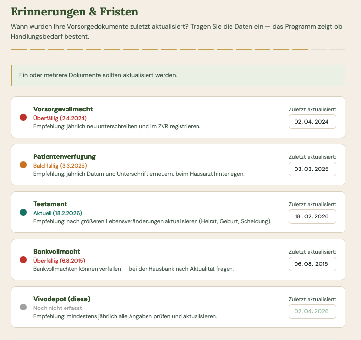 Vivodepot führt Sie in 18 Schritten durch alle Lebensbereiche - von Gesundheit und Vollmachten bis zu Finanzen und Ihren letzten Wünschen.